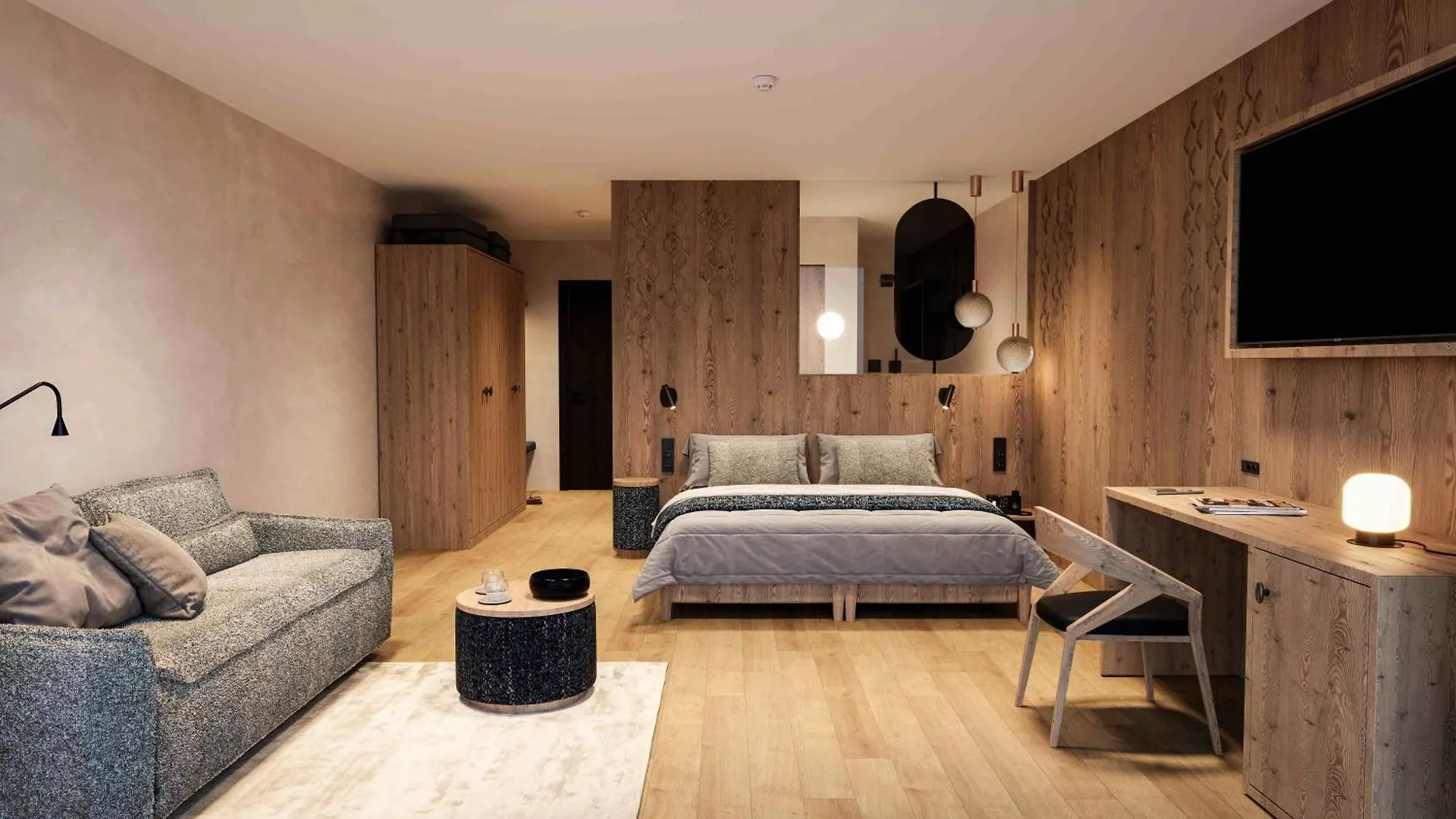 Le camere dell'Hotel Carmen Dolomites si distinguono per uno scrittoio, un salottino e finestre insonorizzate.
